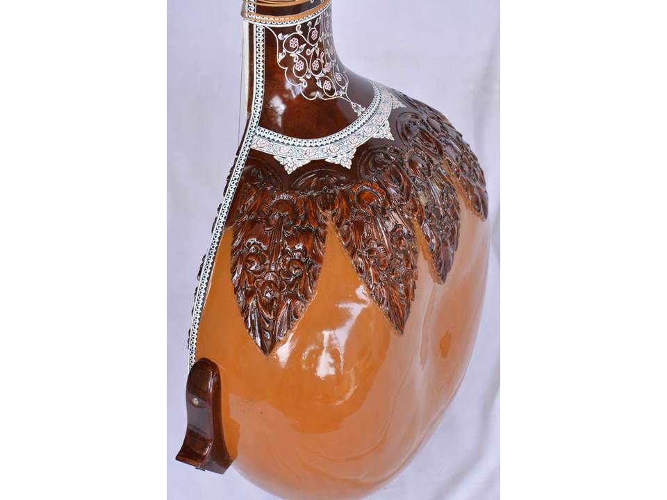 Handmadeproduct,one of the most beautiful Instruments in the world of Bass Sitar, Made from well-seasoned wood with exclusive Hand Carving on Wood & pen carving on celluloid! Great finish, handmade decoration on celluloid in a very artistic and antique manner, exactly balanced and clean work with beautifully designed Ganesh head for main string & innovate feature as a hole on sound board for sympatatic strings
