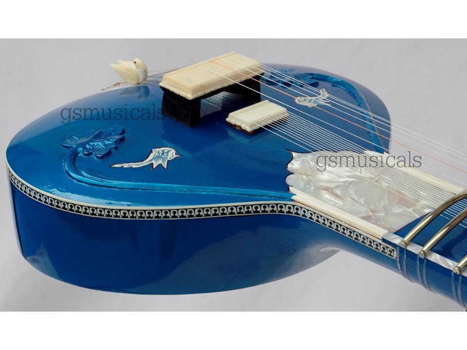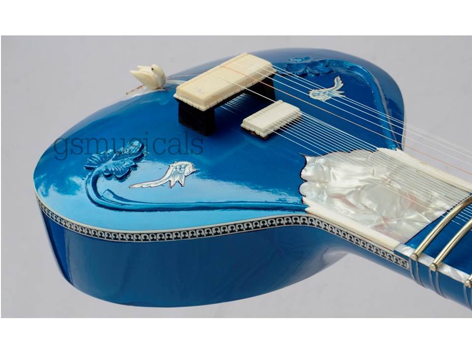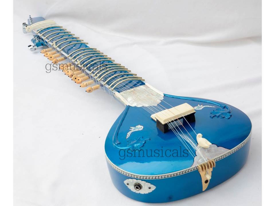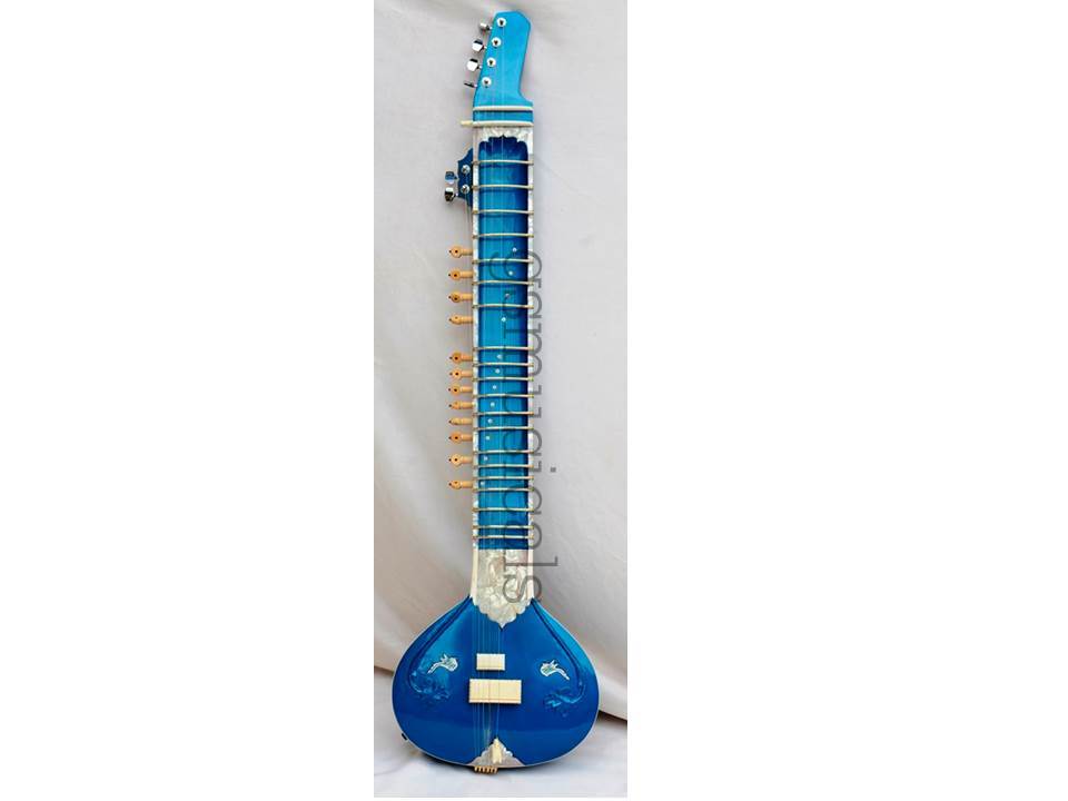 A new Professional semi flat base all wooden sitar,with a complete new outstanding look totally different from others with special finish Made from well-seasoned tun wood, long sustaining sound and fine tonal quality!!!! Fine craftsmanship, decorated with inlay Mother of Pearl, Best quality frets, strings fitted with machine mechanic for easy stable and fine tuning of the main strings and chikari traditional wooden pegs for Sympathetic strings.The machine heads used are of export quality, strings are of Germany.