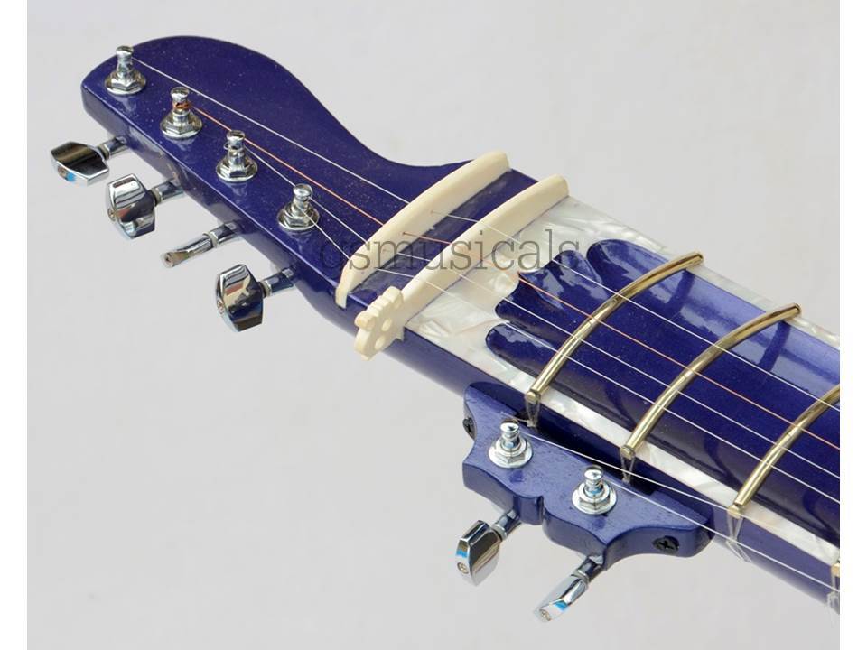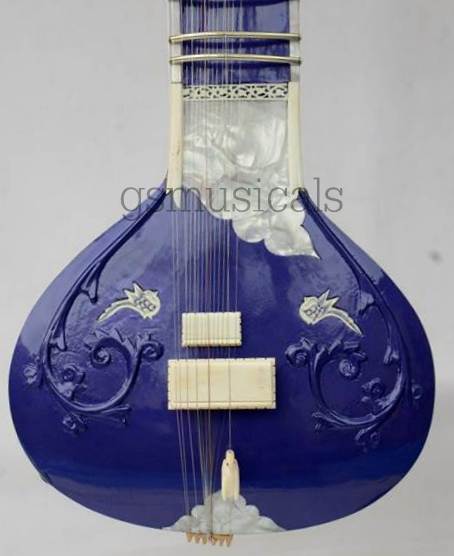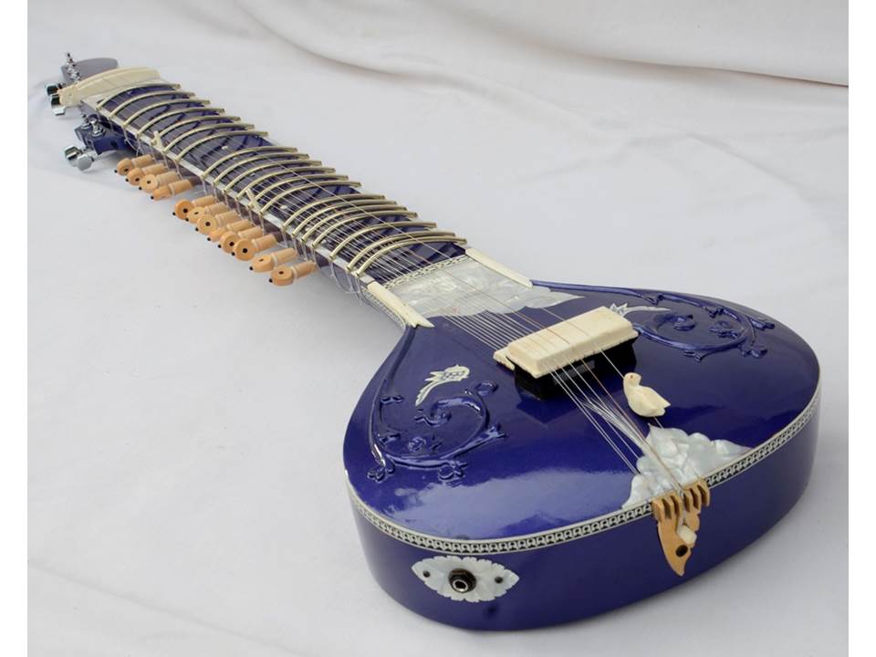 A new Professional semi flat base all wooden sitar, with a complete new outstanding look totally different from others with special finish made from well-seasoned tun wood, long sustaining sound and fine tonal quality!!!! Fine craftsmanship, decorated with inlay Mother of Pearl, Best quality frets, strings fitted with machine mechanic for easy stable and fine tuning of the main strings and traditional wooden pegs for Sympathetic strings and Chikaris. The machine heads used are of export quality, strings are of Germany {rosalo} Easy to HANDLE, TRAVEL AND AMPLIFY
