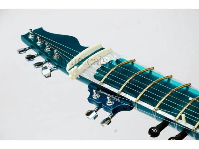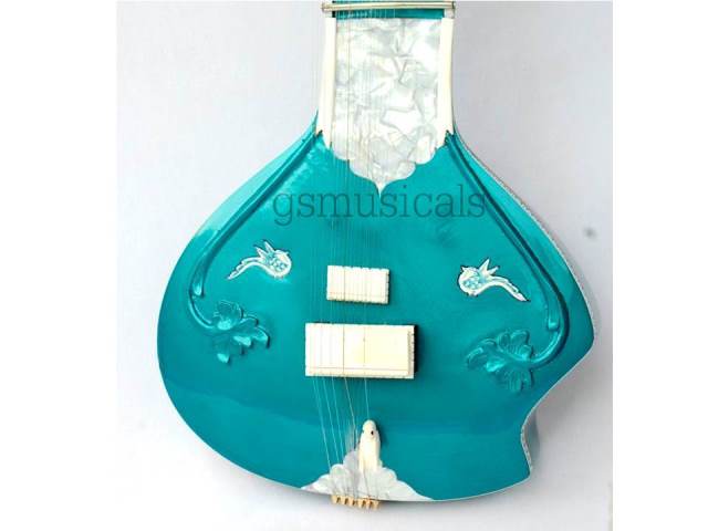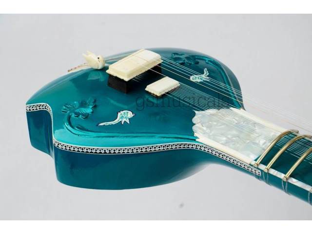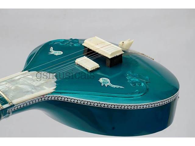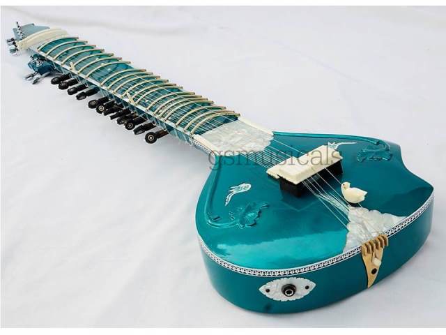 A new Professional semi flat base all wooden sitar, with a complete new outstanding look totally different from others with special finish made from well-seasoned tun wood, long sustaining sound and fine tonal quality!!!! Fine craftsmanship, decorated with inlay Mother of Pearl, Best quality frets, strings fitted with machine mechanic for easy stable and fine tuning of the main strings and chikari traditional wooden pegs for Sympathetic strings.The machine heads used are of export quality, strings are of Germany {rosalo}. Easy to HANDLE, TRAVEL AND AMPLIFY