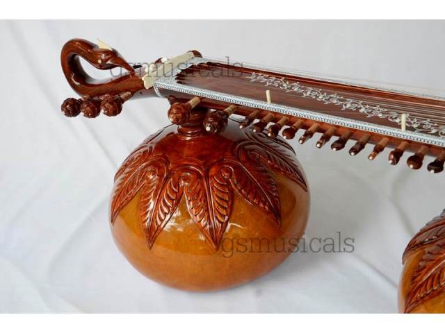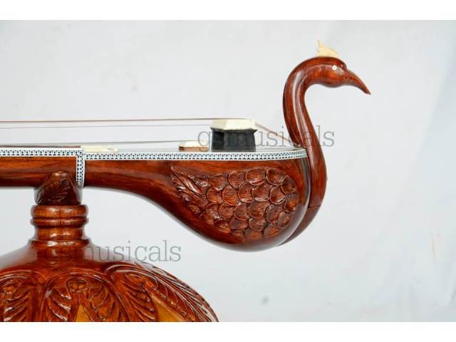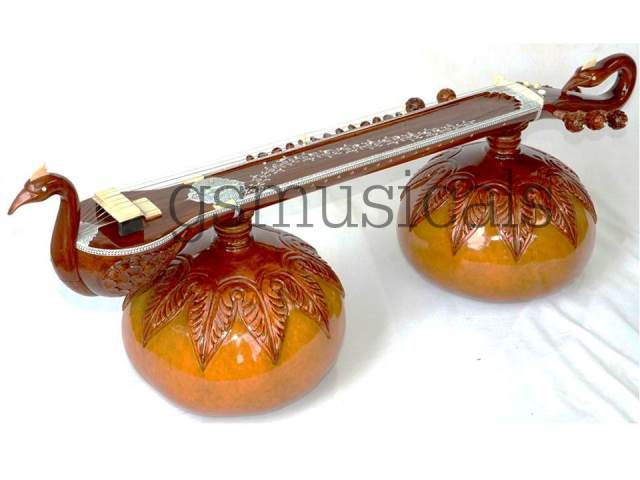 The Vichitra Veena is an one of the Ancient Instrument in Indian Classical Music, It is made of two same size Pumpkins & wood of tunna cedara the size of pumpkin is approx 49 inches & the freat board is of 4.7 inches it is decorated with inlay of cellolide & beautifully peacock fitted on head stock and on the front long lasting sound.