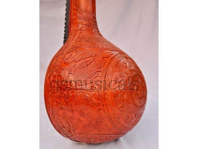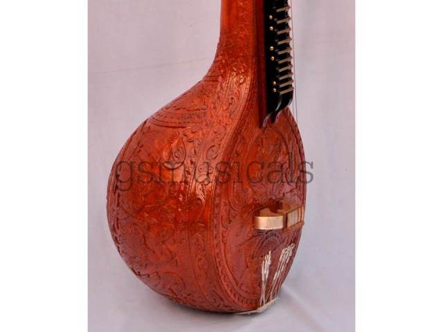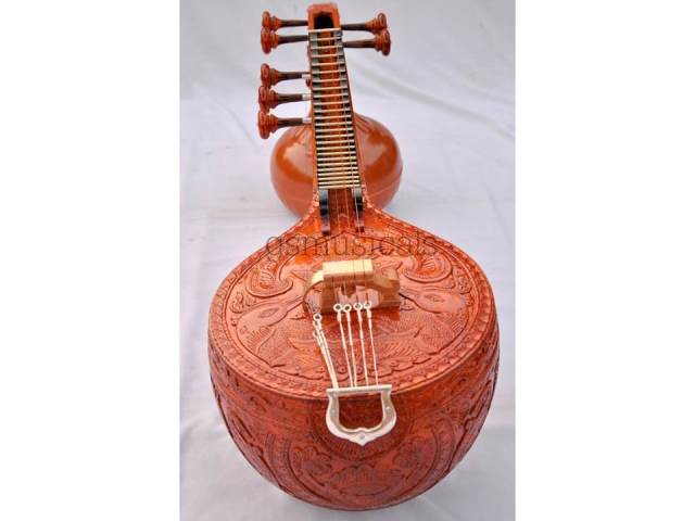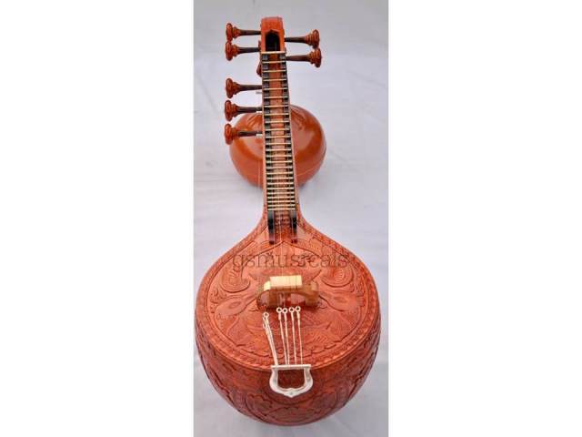The Veena is an one of the Ancient Instrument in Indian Classical Music, It is made of two same size Pumpkins & wood of tunna cedara the size of pumpkin is approx 49 inches & the freat board is of 4.7 inches it is decorated with inlay of cellolide & beautifully peacock fitted on head stock and on the front long lasting sound.
