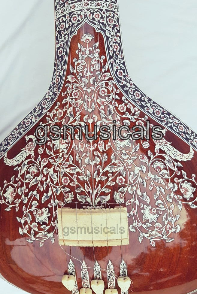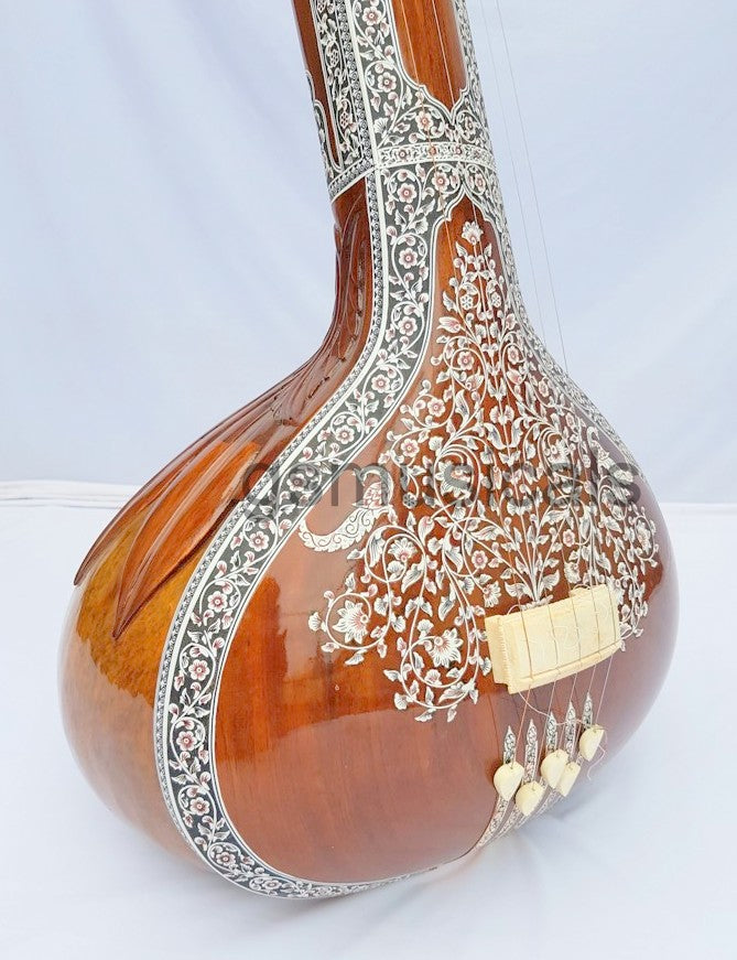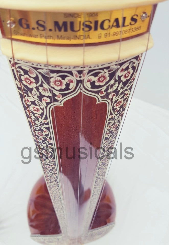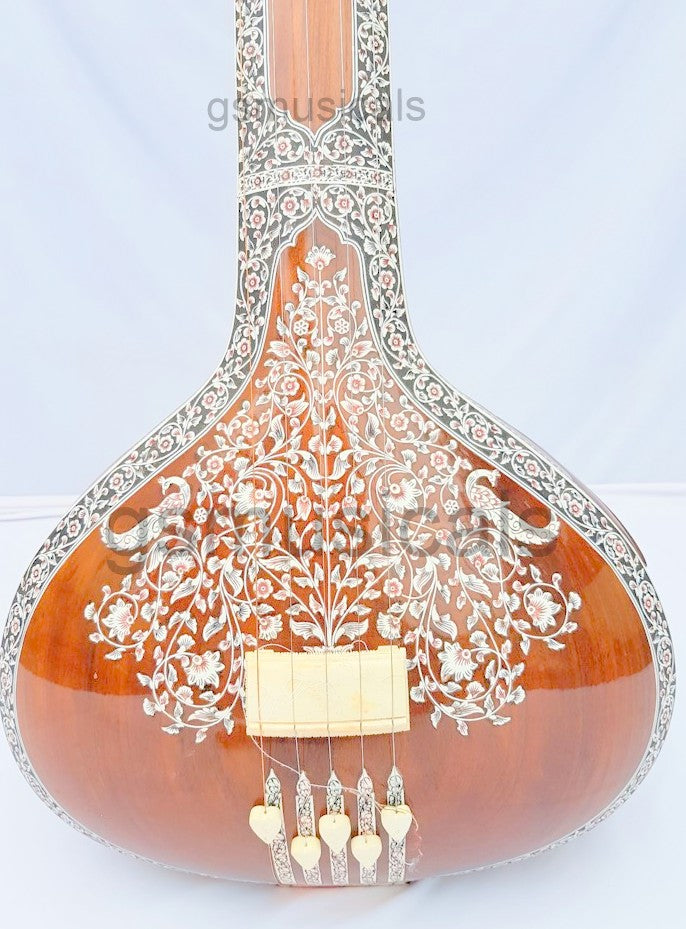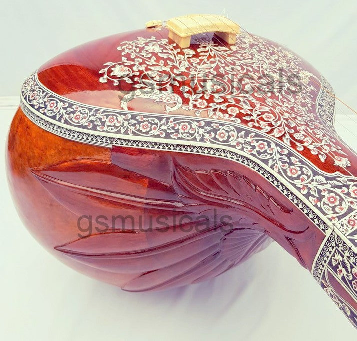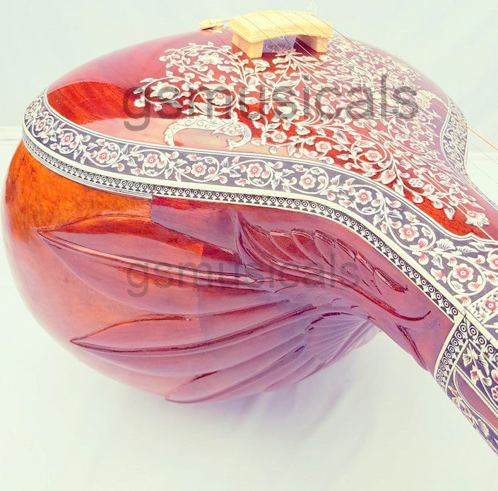 Handmade product, this is a beautiful Tanpura with all design in very artistic and antic manner we have used any inlay on this tanpura for decoration. This tanpura is the Made from well-seasoned tun wood it has sustaining sound and fine tonal quality!!!! Fine craftsmanship, completely decorated with Hand Tanpura comes with Special Addition, It is in built with peigeo pick up for greater effect. Which means you can play this Tanpura just like any other Tanpura and at the same time it can be amplified with a single output jack socket as per your requirement.