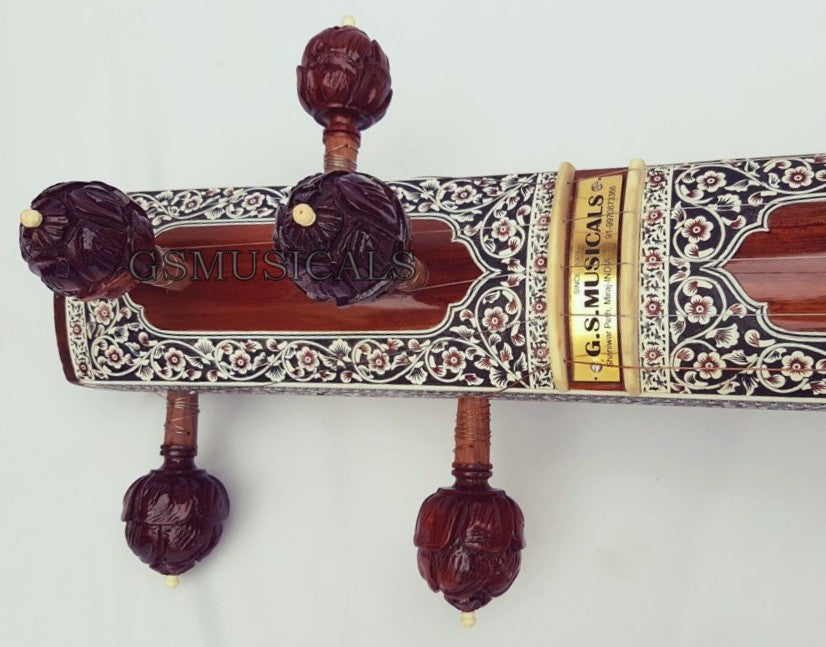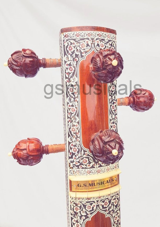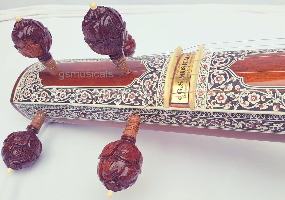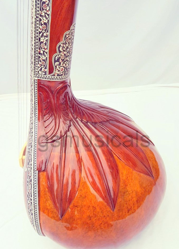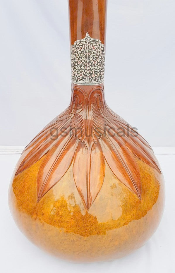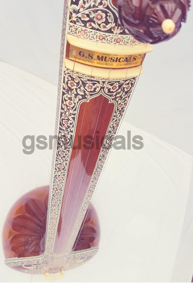 Handmade product, this is a beautiful Tanpura with all design in very artistic and antic manner we have used any inlay on this tanpura for decoration. This tanpura is the Made from well-seasoned tun wood it has sustaining sound and fine tonal quality!!!! Fine craftsmanship, completely decorated with Hand Tanpura comes with Special Addition, It is in built with peigeo pick up for greater effect. Which means you can play this Tanpura just like any other Tanpura and at the same time it can be amplified with a single output jack socket as per your requirement.