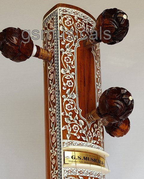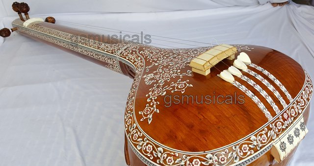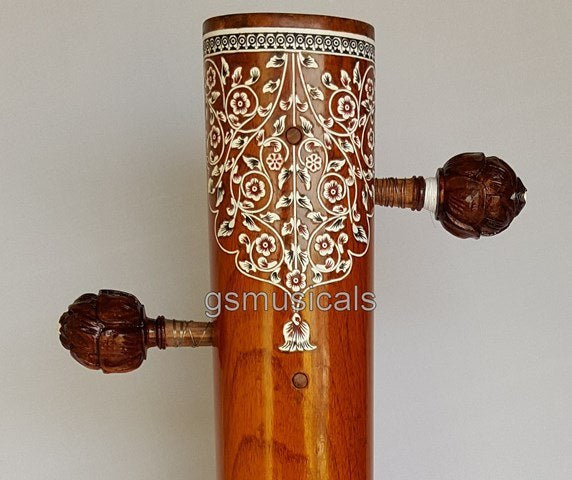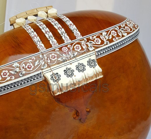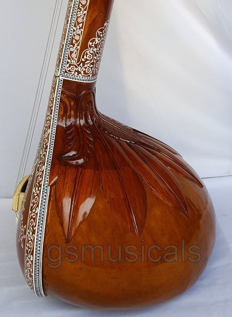 Handmade product, this is a beautiful Tanpura with all design in very artistic and antic manner we have used any inlay on this tanpura for decoration. This tanpura is the Made from well-seasoned tun wood it has sustaining sound and fine tonal quality!!!! Fine craftsmanship, completely decorated with Hand Tanpura comes with Special Addition, It is in built with peigeo pick up for greater effect. Which means you can play this Tanpura just like any other Tanpura and at the same time it can be amplified with a single output jack socket as per your requirement.