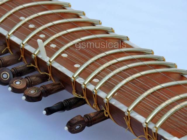 Fine craftsmanship, decorated with inlayMother of Pearl, Best quality frets, strings fitted with machine mechanic foreasy stable and fine tuning of the main strings and chikari traditional wooden pegs for Sympathetic strings.