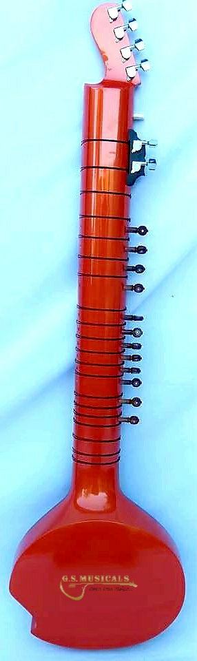 A new Professional semi flat base all wooden sitar, with a complete new outstanding look totally different from others with special finish Made from well-seasoned tun wood, long sustaining sound and fine tonal quality!!!! Fine craftsmanship, decorated with inlay Mother of Pearl, Best quality frets, strings fitted with machine mechanic for easy stable and fine tuning of the main strings and chikari traditional wooden pegs for Sympathetic strings. The machine heads used are of export quality, strings are of Germany.