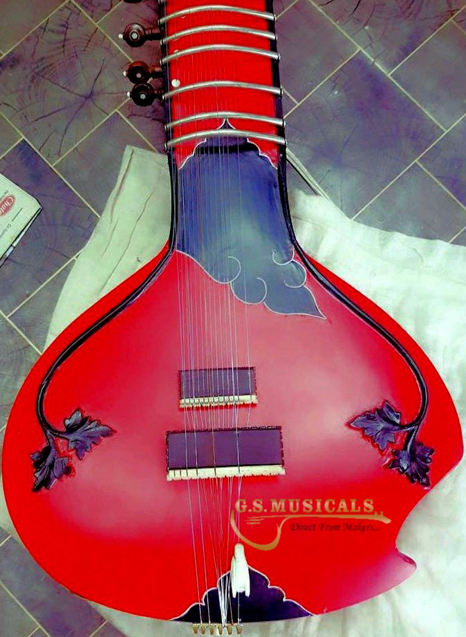 A new Professional semi flat base all wooden sitar, with a complete new outstanding look totally different from others with special finish Made from well-seasoned tun wood, long sustaining sound and fine tonal quality!!!! Fine craftsmanship, decorated with inlay Mother of Pearl, Best quality frets, strings fitted with machine mechanic for easy stable and fine tuning of the main strings and chikari traditional wooden pegs for Sympathetic strings. The machine heads used are of export quality, strings are of Germany.