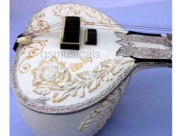 Handmade product,one of the most beautiful Instruments in the world of musical Instruments, Made from well-seasoned TUN wood with special WHITE GOLDEN finish ,exclusive Hand Carving on Wood & pen carving on celluloid! Great finish, handmade decoration on celluloid in a very artistic and antique manner, exactly balanced and clean work with beautifully designed bird head for main string & innovate feature as a hole on sound board to increase the depth of sound