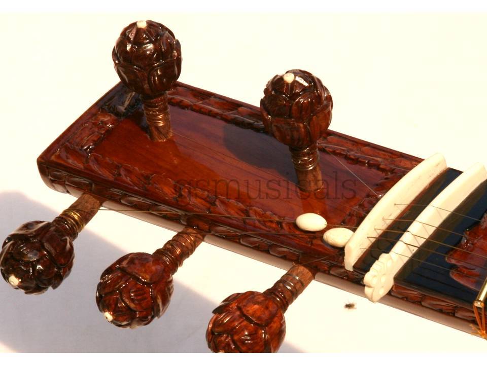 Handmade product This is a beautiful sitar with all hand carving on the whole sitar body in very artistic and antic manner & Hemraj design on the neck , we have not used any inlay on this sitar for decoration, This sitar is the Made from well-seasoned tun wood it has sustaining sound and fine tonal quality!!!! Fine craftsmanship, completely decorated with Hand carving work,sitar comes with Special Addition, It is in built with peigeo pick up for greater effect. Which means you can play this sitar just like any other sitar and at the same time it can be amplified with a single output jack socket as per your requirement