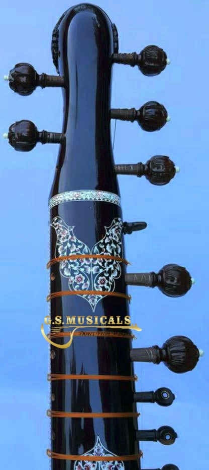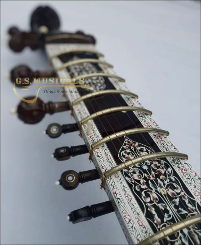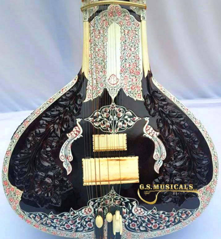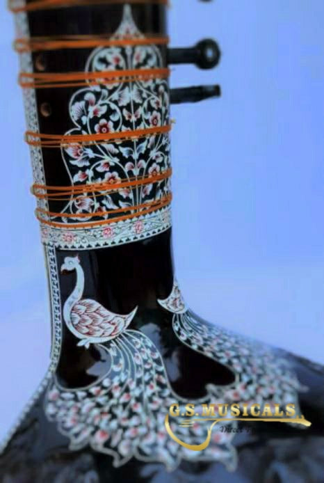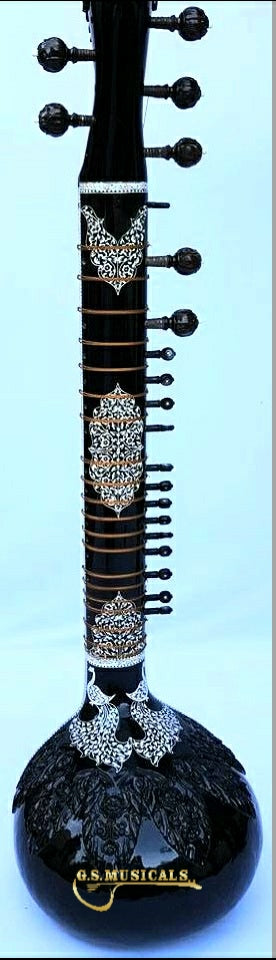 You will get the finest tonal quality, long sustaining sound with beautifully decorated with carving on neck, tabli and pen carving on inlay of Celluloid in a very artistic manner from top to bottom of sitar It is in built with peigeo pick up for greater effect. Which means you can play this sitar just like any other sitar and at the same time it can be amplified with a single output jack socket as per your requirement